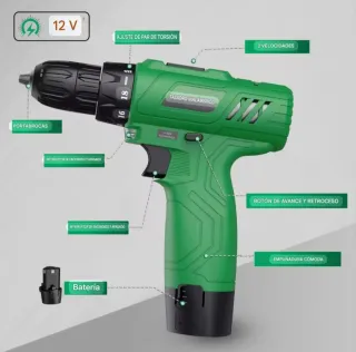 Taladro atornillador inalambrico con accesorios y batería recargable8 12V 1500mAh. Par de torsion de 25N.m con 18+1 ajustes del par. Función taladro y atornillador con giro en 2 direcciones. Mandril de 3 mandíbulas sin llave y luz led. - Taladro atornillador inalámbrico. - Batería recargable 12V. - Set de brocas, vasos y puntas. - Prolongador flexible. - Cargador incluido. - Nivel de burbuja.