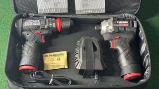 Set de herramientas Parkside que incluye un taladro atornillador 35Nm de par y un atornillador de impacto con 170Nm de par Artículos nuevos y sellados con 5 años de garantía - Taladro atornillador 12V. - Atornillador de impacto 12V. - Incluye 2 baterías recargables y cargador. - Maletín de transporte. Tags: taladro, atornillador, destornillador, herramientas, baterías, oferta, chollo, parkside, performance, profesional, amoladora, sierra, útiles, hilti, makita, dewlt, diy, nuevo, garantía