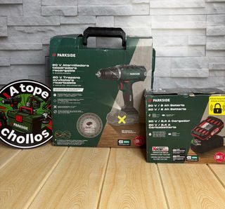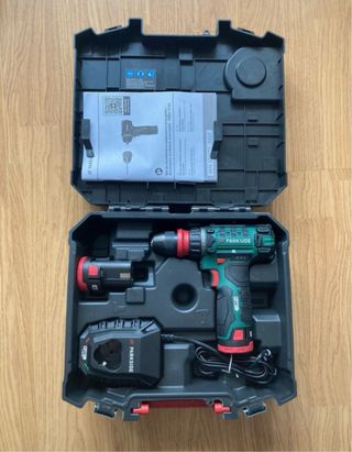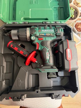 Taladro/atornilladora Parkside con batería X20VTEAM y cargador. Nuevo sin usar, la bateria no tiene ni un ciclo de carga. - Incluye maletín de transporte. - Batería de 20V. - Cargador rápido.