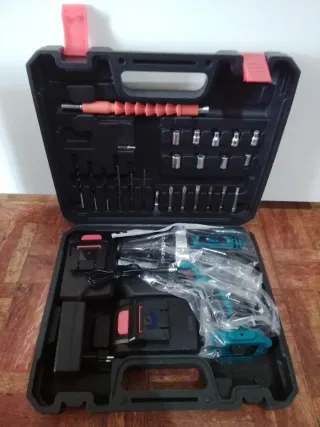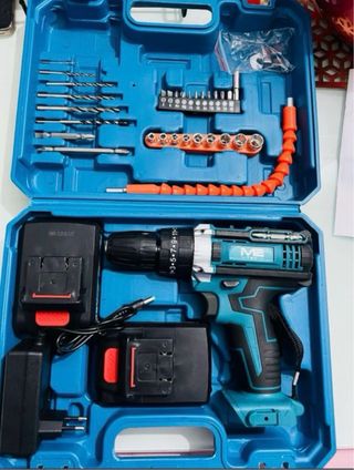 Taladro atornillador ME de 48V con dos baterías incluidas. Incluye un maletín organizador con accesorios. - Taladro atornillador ME 48V - 2 Baterías de 2400mAh Li-ion - Cargador - Maletín de transporte - Juego de brocas y puntas Producto nuevo a extrenar
