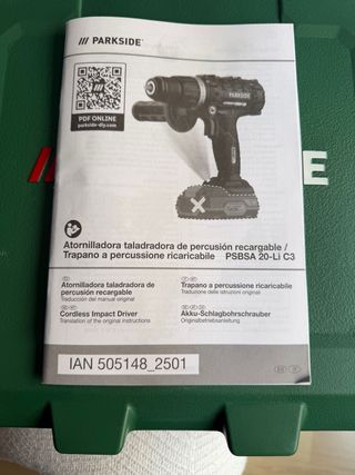 Atornilladora taladradora de percusión recargable Parkside...Mas BATERIA Se VENDE por no darle uso... - Modelo: PSBSA 20-Li C3 - Incluye manual de instrucciones original. - IAN: 505148_2501