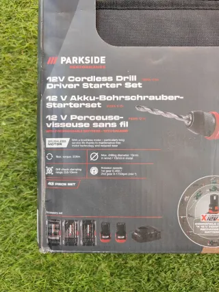 Set de taladro y atornillador recargable de 12V de la marca Parkside. Incluye batería y cargador. - Niveles de par de apriete: 19 + 1. - Diámetro de perforación máx: 25 mm en madera / 10 mm en metal. - Velocidad de giro: 0-350 / 0-1300 rpm. - Abertura del portabrocas: 0.8-10 mm. - Incluye batería y cargador.
