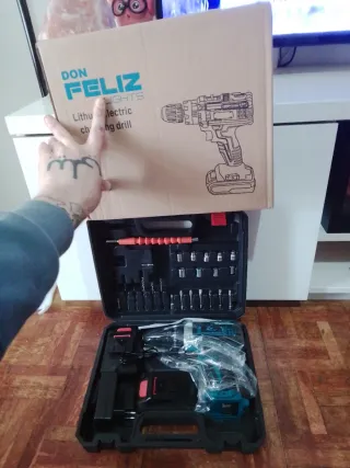 Taladro atornillador eléctrico marca DON FELIZ. - Incluye maletín con accesorios. - Batería de litio recargable.