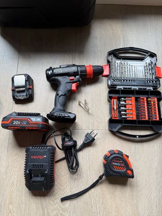 Taladro/atornillador inalámbrico Dnipro-M 20V Li-Ion (2.0Ah). Incluye batería, cargador original, set completo de brocas (metal, madera, hormigón), puntas, vasos y cinta métrica 5m. Funciona perfectamente, en muy buen estado. Ideal para bricolaje, montaje de muebles o trabajos en casa. Se vende por mudanza. 📍 Solo recogida en Madrid.