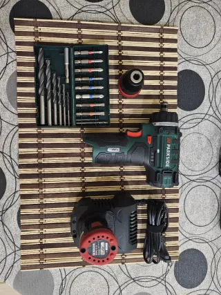 Set básico de taladro atornillador recargable Parkside con accesorios. - Incluye taladro atornillador. - Batería recargable. - Cargador. - Juego de brocas y puntas.