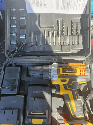 Taladro atornillador ONDRAGON, una herramienta cómoda para tus proyectos. - Incluye taladro, cargador y 2 baterías. - Set de brocas y puntas. - Maletín para transporte.