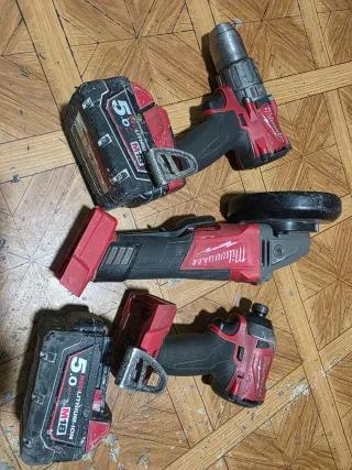 Set de 3 herramientas eléctricas Milwaukee. - Taladro percutor - Amoladora angular - Atornillador de impacto - Dos baterías M18 de 5.0 Ah