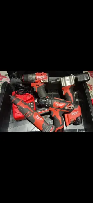 Vendo Lote de herramientas eléctricas Milwaukee - Taladro atornillador.M12 BPD -Taladro atornillador M12 FPD 2 - Remachadora.M12 BPRT - herramienta rotativa dremel M12 BLROT - dos baterias de 5.0ah idos de 2.0ah - Cargador rapido i maleta En perfecto estado i funcionamiento Hilti dewalt wurth hikoki berner festool mafell virutex makita wueka hikoki metabo