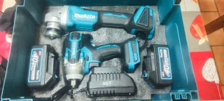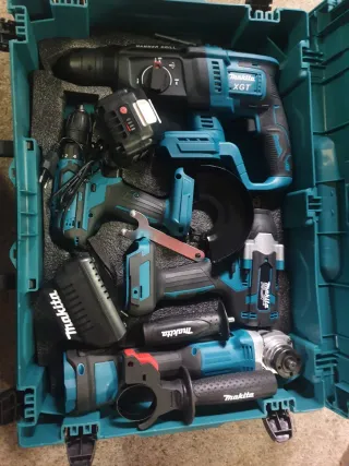 Se vende kit de herramientas eléctricas Makita en su maletín. - Incluye amoladora angular, taladro percutor, atornillador de impacto, tornlladora 4 maquinas y cargador. - Tres baterías. - Llave de ajuste.