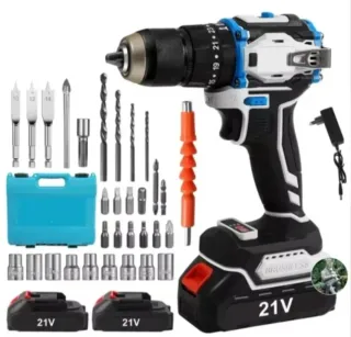 Taladro atornillador inalambrico con accesorios. Baterías recargables 21V (compatible con Makita). Par de torsion de 70N.m con 25+3 ajustes del par. Función taladro, atornillador y percutor con giro en 2 direcciones. Mandril portabrocas metálico de 3 mandíbulas sin llave, luz led e indicador del nivel de bateria. Pinza para sujetar mientras se trabaja. -Taladro atornillador inalámbrico. -2 Baterías recargable 21V (compatibles con Makita) -Cargador. -Juego de brocas. -Juego de puntas planas y estrella. -Juego de vasos.