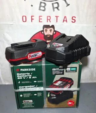 Kit de batería y cargador Parkside. - Batería de 20V y 2Ah. - Cargador 20V 2.4A - Compatible 20V XTEAM Tags: bricolaje, herramientas, diy, taller, manualidades, trabajosencasa, arreglos, multiherramienta, atornilladora, taladro, sierra, lijadora, destornillador, llaves, compresor, nivel, inalambrica, bateriaincluida, conbateria, electricas, manual, litio, recargable, parkside, bosch, makita, dewalt, blackanddecker, einhell, stanley, segundaMano, ocasión, chollo, electricista, impacto, 1898Nm ,20v , 8 Ah, rueda, herramientas, Parkside,