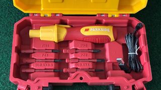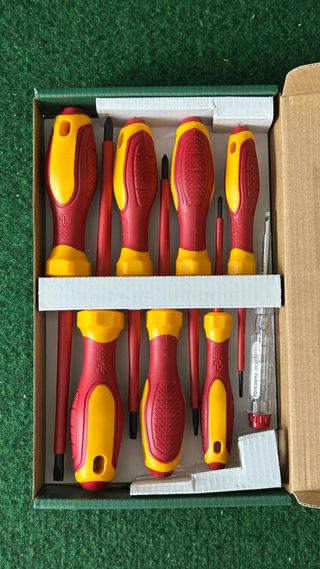 Conjunto de herramientas eléctricas de la marca Parkside. Incluye destornilladores y alicates. - Mango ergonómico de goma y plástico. - Herramientas con aislamiento para trabajos eléctricos. Tags: electricista, automoción, destornillador, taladros, atornillador, destornillador, amoladora, radial, percusión, tensión, 1000V, chollo, diy, parkside, makita, hilti, milwakee, performance, brushless