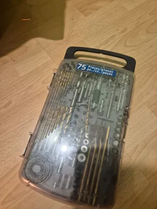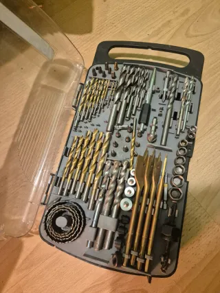 Completo kit de brocas y accesorios para todo tipo de trabajos con taladro. Incluye una gran variedad de brocas de diferentes tamaños y tipos, así como accesorios complementarios. - Brocas para metal y madera. - Brocas planas. - Sierras de corona. - Puntas de atornillar. - Adaptadores y vasos.