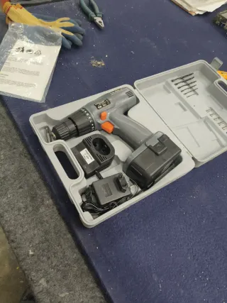 Maletín completo de taladro/atornillador/percutor inalámbrico ideal para bricolaje en casa o taller. Incluye taladro 21V, 2 baterías recargables de alta capacidad y cargador rápido. Múltiples accesorios: 3 brocas para piedra, 3 brocas para madera, puntas de atornillar, vaso de llaves de tubo, alicates, destornilladores, cúter, cinta métrica, cinta aislante y eje flexible extensible para zonas de difícil acceso. Velocidad regulable y función percutor para paredes. Todo organizado en resistente maletín de transporte. Nuevo sin usar.