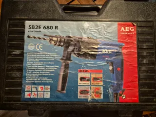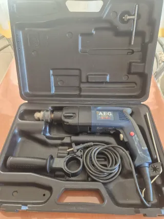 Taladro atornollador y percutor de la marca AEG con 680W de potencia, de 1350/3200 revoluciones p/minuto. Incluye maletín y accesorios. - Maletín de transporte. - Empuñadura auxiliar. - Tope de profundidad.