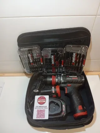Taladro Parkside con su cargador su batería y accesorios. - Taladro inalámbrico. - Incluye juego de brocas y puntas. - Cargador y batería. - Maletín de transporte. tags: Lidl, Bosch, Maquita, Dewalt, Stayer, Inverter, Hilti, Worx, Metabo, Einhell, carpintero, carpintería, batería, pintór, pintura, reforma, obra, metal, percusión, radial, amoladora, sierra caladora circular laser, compresor, llave, atornillador, atornilladora, soldar, soldadura, aparato, pistola, grapadora, lijadora herramienta compresor, ingletadora, impacto, fresadora, broca, aspiradora, taladro martillo,bricolaje,manualidades,lienzos