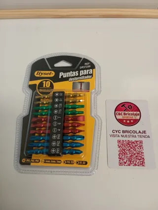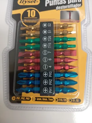 Set de 10 puntas para destornillador de la marca Lyset. - Incluye puntas PH1, PH2, PH3. - Incluye puntas T15, T20. - Incluye puntas S1, S2. - Incluye puntas de 6mm y 7mm. Uso profesional. tags: Lidl, Bosch, Maquita, Dewalt, Stayer, Inverter, Hilti, Worx, Metabo, Einhell, carpintero, carpintería, batería, pintór, pintura, reforma, obra, metal, percusión, radial, amoladora, sierra caladora circular laser, compresor, llave, atornillador, atornilladora, soldar, soldadura, aparato, pistola, grapadora, lijadora herramienta compresor, ingletadora, impacto, fresadora, broca, aspiradora, taladro martillo,bricolaje,manualidades,lienzos