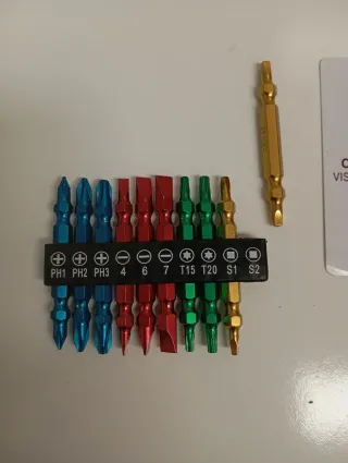 Set de puntas para destornillador con diferentes tipos y tamaños. - Puntas PH1, PH2, PH3. - Puntas planas 4, 6, 7. - Puntas Torx T15, T20. - Puntas S1, S2. - USO PROFESIONAL tags: Lidl, Bosch, Maquita, Dewalt, Stayer, Inverter, Hilti, Worx, Metabo, Einhell, carpintero, carpintería, batería, pintór, pintura, reforma, obra, metal, percusión, radial, amoladora, sierra caladora circular laser, compresor, llave, atornillador, atornilladora, soldar, soldadura, aparato, pistola, grapadora, lijadora herramienta compresor, ingletadora, impacto, fresadora, broca, aspiradora, taladro martillo,bricolaje,manualidades,lienzos