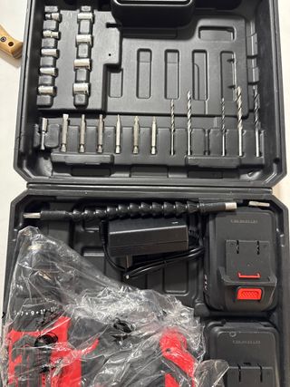 Completo set de herramientas para tus proyectos. - Taladro inalámbrico con baterías y cargador. - Juego de brocas y puntas. - Extensión flexible para taladro. - Diversos accesorios y adaptadores.