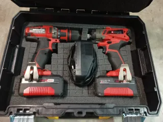 Se vende taladro y atornillador de la marca Einhell, en color rojo y negro. Incluye cargador y dos baterías. - Taladro percutor. - Atornillador de impacto. - Dos baterías de 18V. - Cargador de batería.