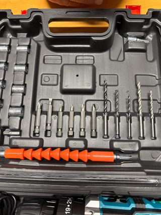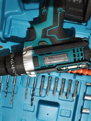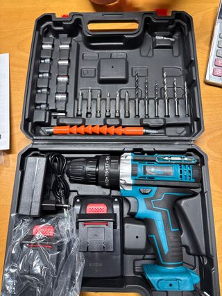 Taladro atornillador inalambrico con accesorios. Baterías recargables. Par de torsion de 45N.m con 25+3 ajustes del par. Función taladro, atornillador y percutor con giro en 2 direcciones. Mandril de 3 mandíbulas sin llave y luz led. -Taladro atornillador inalámbrico. -2 Baterías recargables. -Cargador. -Juego de brocas. -Juego de puntas planas y estrella. -Juego de vasos. -Extensión flexible. -Maletín de transporte. 📝Para otras cantidades contactar.