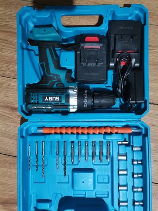 Taladro inalámbrico SUBY en su maletín azul. - Incluye cargador y dos baterías. - Juego de brocas y puntas. - Extensor flexible.