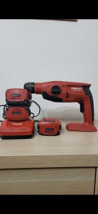 Se vende taladro rotativo Hilti a batería, junto con dos baterías y un cargador. - Taladro Hilti TE 2-A22. - Batería Hilti B22 3.0 Ah. - Batería Hilti B22 2.6 Ah. - Cargador Hilti C4/36-350.