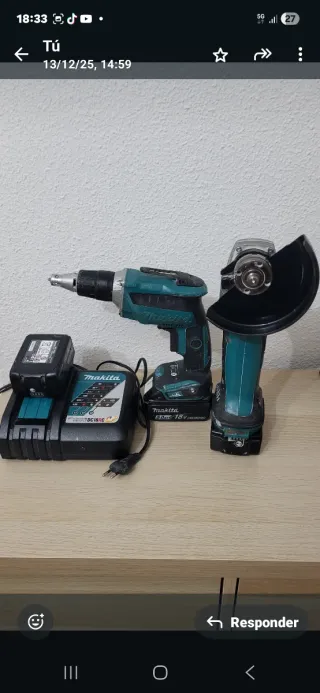 Se venden dos máquinas a batería de la marca Makita, junto con su cargador y una batería. - Taladro atornillador - Amoladora angular - Cargador - Batería