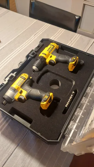 Kit de taladro y atornillador Dewalt DCZ21152T. - Incluye dos herramientas Dewalt. - Batería de 10.8V Li-Ion de 1.5 Ah. - Sistema TSTAK. - Las baterias NO CARGAN. Hay que restituir. (de ahi el precio)
