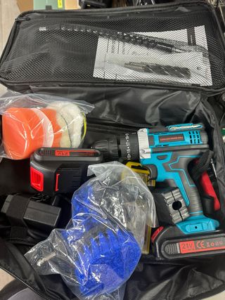 Set de herramientas eléctricas y accesorios para el hogar o taller. - Taladro inalámbrico con baterías. - Juego de brocas. - Cepillos de limpieza. - Discos de pulido.
