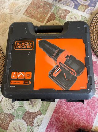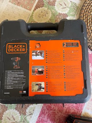 Taladro eléctrico Black+Decker en su maletín. - Incluye taladro, cargador y batería. - Modelo BDCDC18. - Batería de litio 18V 1.5Ah. - Cargador de 10.8V-18V.