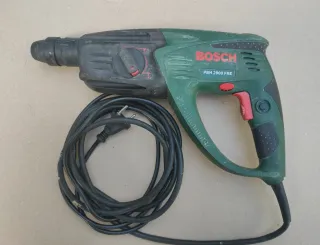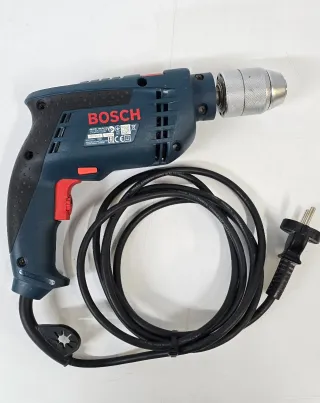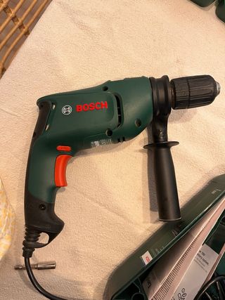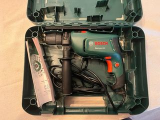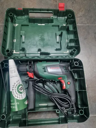 Taladro percutor de la marca Bosch, ideal para trabajos de bricolaje y construcción. - Incluye maletín para transporte. - Mango auxiliar para mayor control. - Cable de alimentación.