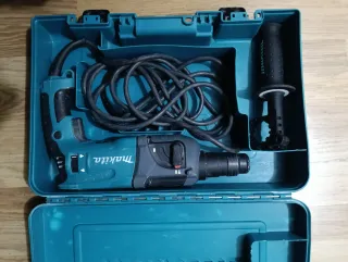 Taladro percutor de la marca Makita, modelo HR2630T. Ideal para trabajos de bricolaje y profesionales. - Incluye maletín para transporte y almacenamiento. - Empuñadura auxiliar y tope de profundidad. Caja con broncas y accesorios.