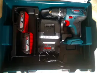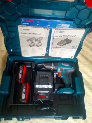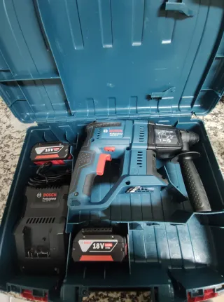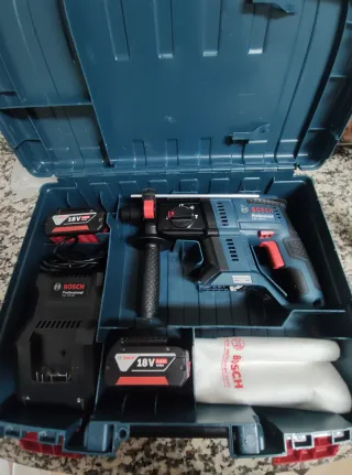 Taladro percutor Bosch profesional, ideal para trabajos exigentes. Se entrega en su maletín original. - Incluye dos baterías de 18V. - Cargador rápido. - Juego de puntas y brocas.