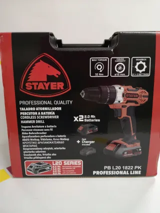 Taladro percutor Stayer con batería de litio. 1 año de garantía. - Incluye dos baterías de 18V y 2.0Ah. - Cargador rápido Stayer. - Maletín de transporte.