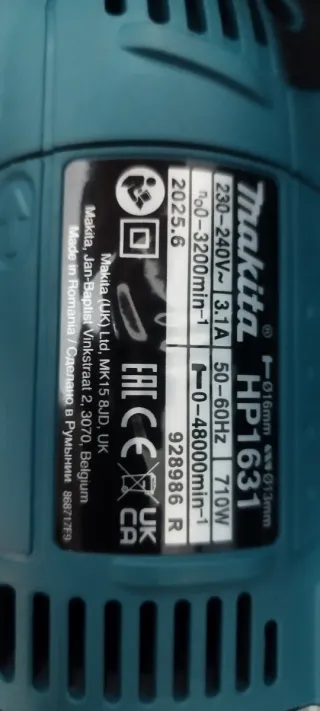 Taladro percutor Makita HP1631K en su maletín original. - Incluye taladro, empuñadura auxiliar y maletín. - Manual de instrucciones.