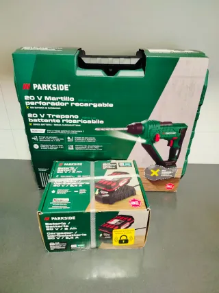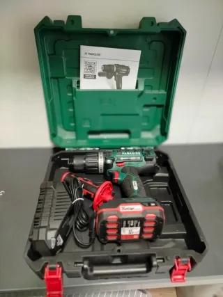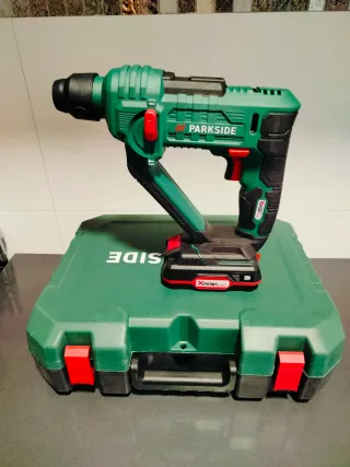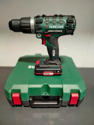 Taladro percutor inalámbrico de la marca Parkside. - Color verde y negro. - Incluye batería X20V. - Viene con su maletín de transporte.