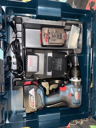Taladro percutor Bosch profesional, ideal para trabajos exigentes. Se entrega en su maletín original. - Incluye dos baterías de 18V. - Cargador rápido. - Juego de puntas y brocas.