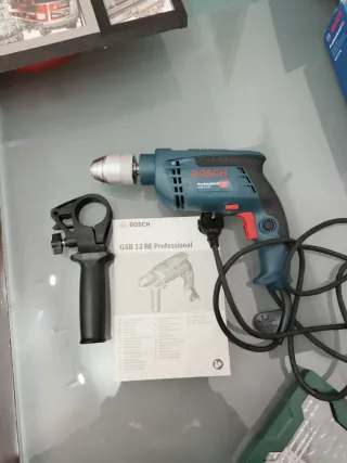 Taladro percutor de la marca Bosch, modelo GSB 13 RE. - Color azul y negro. - Empuñadura auxiliar. - Incluye manual de instrucciones.