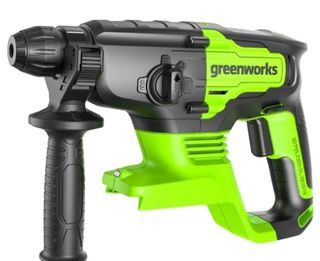 Taladro percutor Greenworks de color verde y negro. - Diseño inalámbrico. - Empuñadura auxiliar. - Indicador de batería. Incluye 2 baterías Cargador 1
