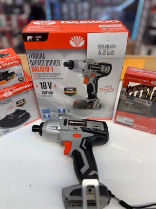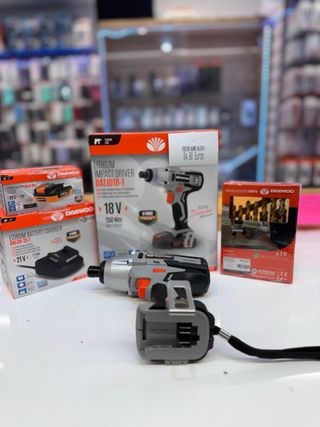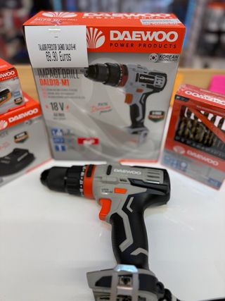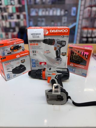 Taladro percutor Daewoo DALD18-M1 con batería de 18V y cargador. - Incluye taladro percutor Daewoo DALD18-M1. - Batería de litio de 18V. - Cargador de batería Daewoo DALCH-25-1 (21V). - Juego de brocas Daewoo (19 piezas).