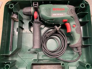 Taladro percutor de la marca Bosch, modelo PSB 750 RCE, con su maletín. En perfecto estado, casi sin uso - Color verde y negro. - Incluye cable de alimentación. - Empuñadura auxiliar