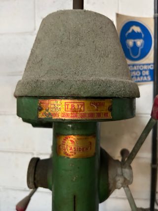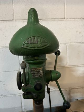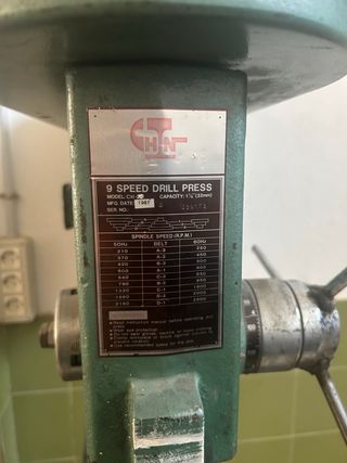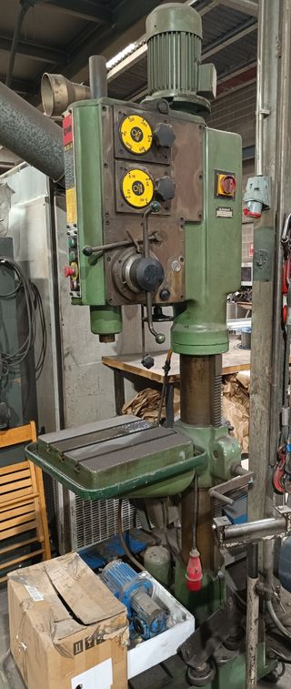 Taladro de columna TLP en buen estado, ideal para trabajos de bricolaje o profesionales. Trifásico. - Estructura robusta de metal. - Plato giratorio con ranuras. - Palanca de avance. - Base estable.
