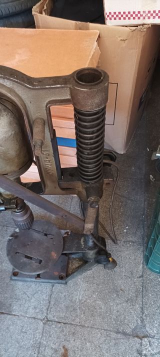Taladro de columna antiguo, ideal para trabajos de bricolaje o coleccionistas. - Estructura metálica robusta. - Base de montaje. - Palanca de descenso.
