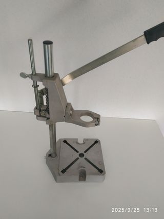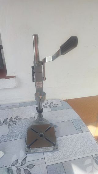 Soporte para taladro manual, ideal para trabajos de precisión. en la última foto se puede ver que la abrazadera que agarra la máquina está rota. igualmente funciona y se puede utilizar - Base estable. - Ajuste de altura. - Mango para facilitar el descenso.