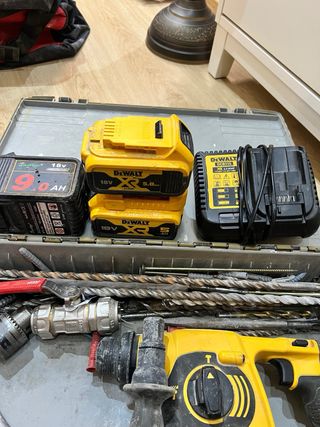 Se vende taladro percutor Dewalt de 18V, ideal para trabajos de bricolaje y construcción. Incluye baterías y cargador. - Taladro percutor Dewalt 18V. - Tres baterías Dewalt 18V (5.0 Ah y 9.0 Ah). - Cargador Dewalt. - Juego de brocas y cinceles.