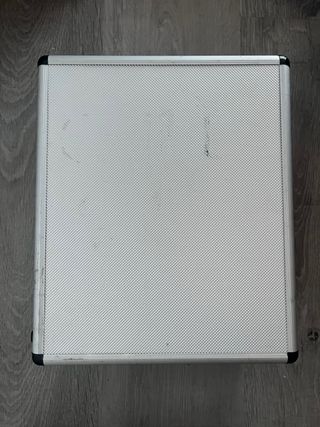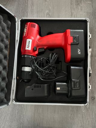 Taladro Hiteck de 12V en su maletín. - Incluye dos baterías. - Cargador de batería. - Maletín de transporte con interior de espuma, un poco destartalado.
