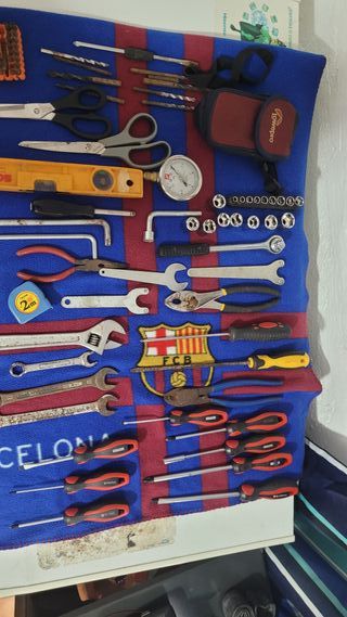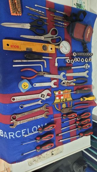 Conjunto de herramientas manuales para diversas tareas. - Incluye llaves fijas y de carraca. - Alicates de corte y de punta. - Juego de destornilladores. - Nivel de burbuja. - Cinta métrica. - Taladros y brocas. - Manómetro.