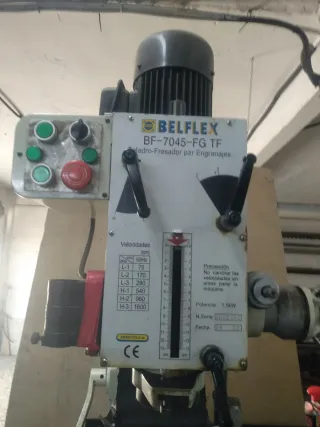 Taladro-fresador BELFLEX modelo BF-7045-FG TF. - Potencia de 1.5kW. - Velocidades de giro indicadas en la tabla (RPM). - Indicador de velocidad con escala. - Botones de control y parada de emergencia.