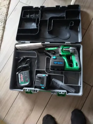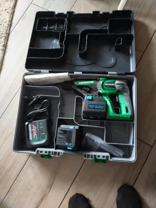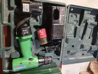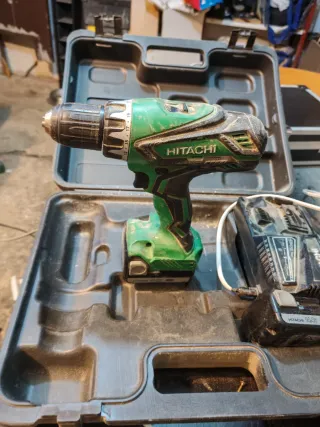 Taladro percutor Hitachi en su maletín original. - Incluye dos baterías. - Cargador de baterías. - Maletín de transporte. Funciona bien las baterías y el cargador se vende por comprar otra más potente poco negociable si no te interesa no molestas con tonterías bloqueó de inmediato